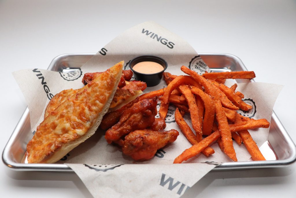 - 5. Arrange yam fries, wings on each side of the plate and place prepared cheese bread crossed over the top of the plate (cut on a sharp bias, corner to corner. Refer to picture)