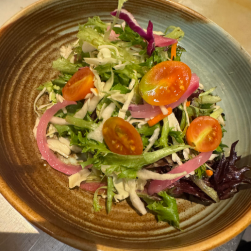 - 2. Transfer to appropriate plating bowl and garnish with: Grape tomatoes (halved), matchstick carrots, pickled onions, coleslaw