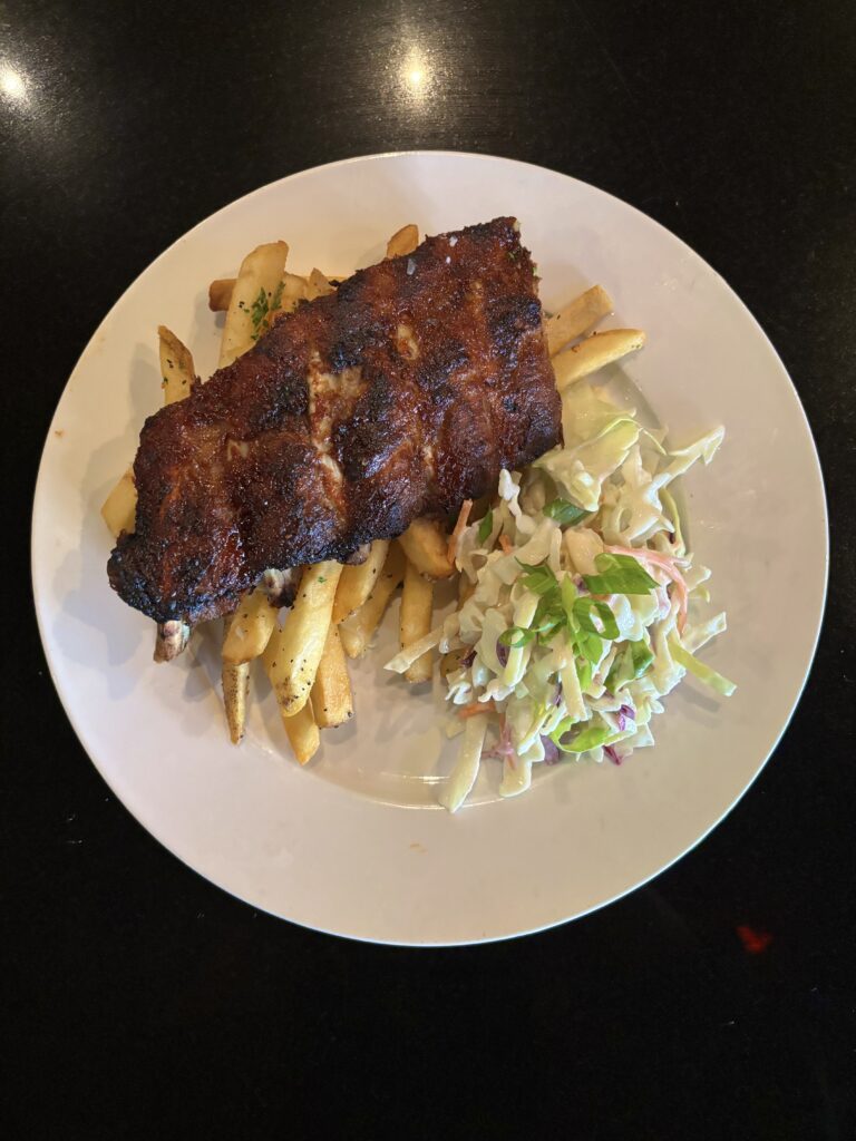 15. Stack the prepared coleslaw on one side of the ribs and the garlic truffle fries high on the opposite side, ensuring both sides are balanced and visually appealing. Refer to the plating reference photo to meet presentation standards.